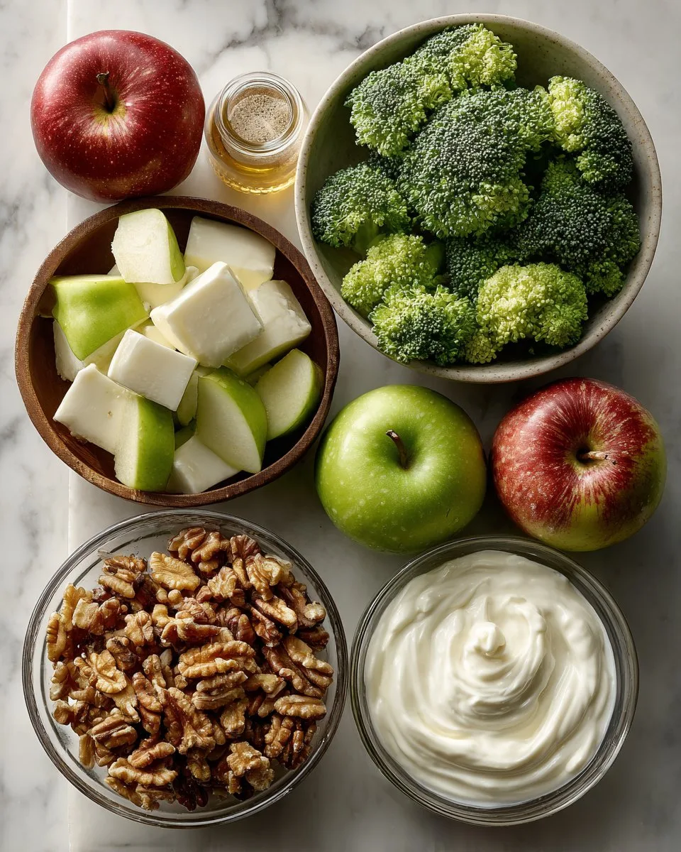 - In a large bowl, combine the broccoli florets, chopped apples, and nuts, ensuring an even mix for maximum flavor.