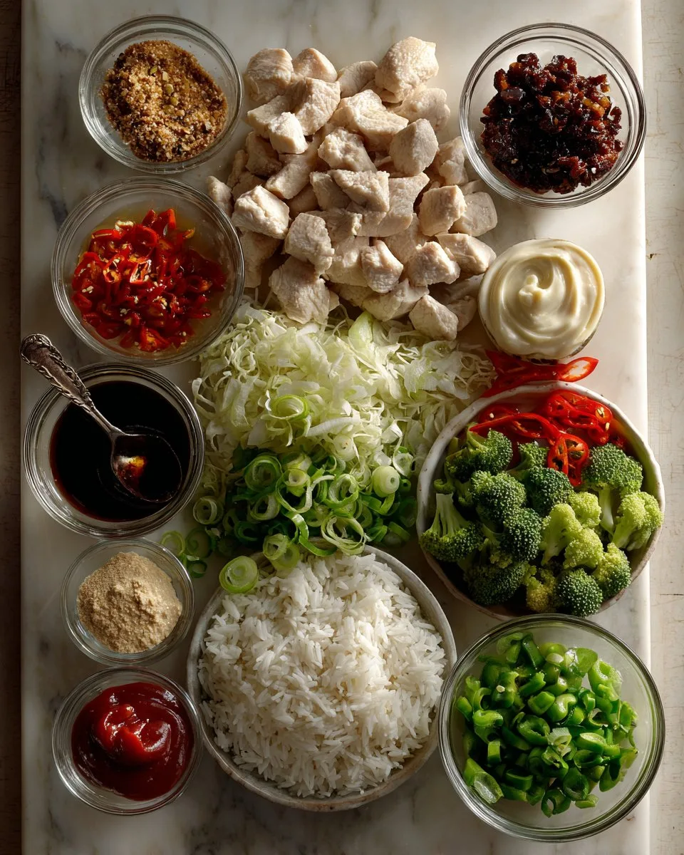 - To assemble your bowls, layer cooked rice, sautéed or steamed vegetables, and top with chicken. Drizzle with the creamy sauce and garnish with green onions or sesame seeds.